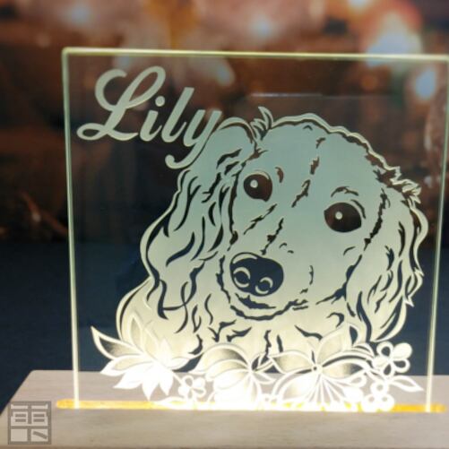 一番可愛いとっておきのお写真から、手作業でイラスト化したものを、お名前と共に心を込めてガラスへ彫刻致します。